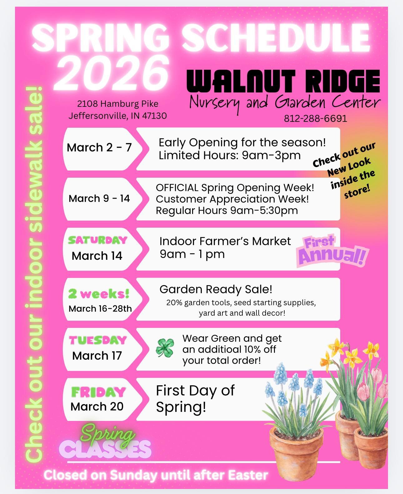 March 2 – 7: Early Opening for the season! Limited Hours: 9:00 am – 3:00 pm. March 9 – 14: OFFICIAL Spring Opening Week! Customer Appreciation Week! Regular Hours 9:00 am –5:30 pm. March 14: First Annual Indoor Farmer’s Market from 9:00 am – 1:00 pm. March 16–28th: Garden Ready Sale! 20% garden tools, seed starting supplies, yard art, and wall decor! March 17: Wear Green and get an additional 10% off your total order! March 20: First Day of Spring! Be sure to also check out our indoor sidewalk sale!